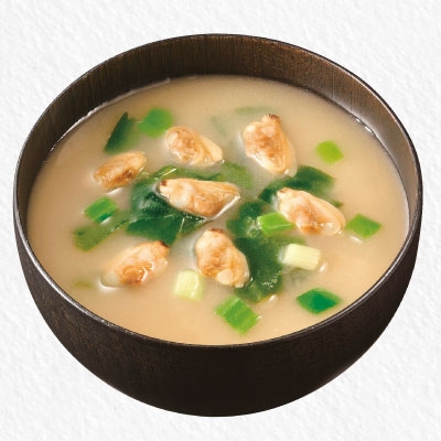 やさしい甘さの米みそに、あさりの煮汁から抽出した旨みたっぷりのエキスを合わせた濃いだし仕立ての一杯。ごろっと入ったあさりのむき身は歯ごたえも感じられ、噛むたびに旨みが溢れます。
